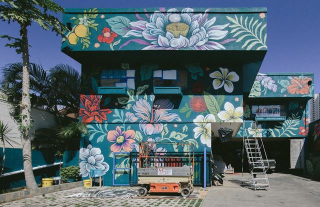 ワイキキの中心部から車で約10分程度の距離にあるカカアコ地区には、カラフルなウォールアートがいっぱい!カメラに収まりきらないほどの大きなものや、パワフルで迫力満点のもの、繊細なタッチで描かれたもの・・・。