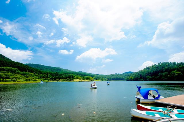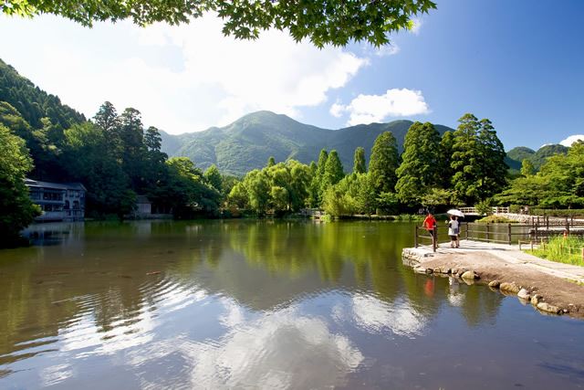 由布岳が望める、海抜600mの高原にある、雨水だけでできた小さな湖です。湖には、白鳥のボートもありますが、本物の白鳥も住んでいます。先日は白鳥の雛が誕生。かわいらしい姿に会えるかもしれませんね。