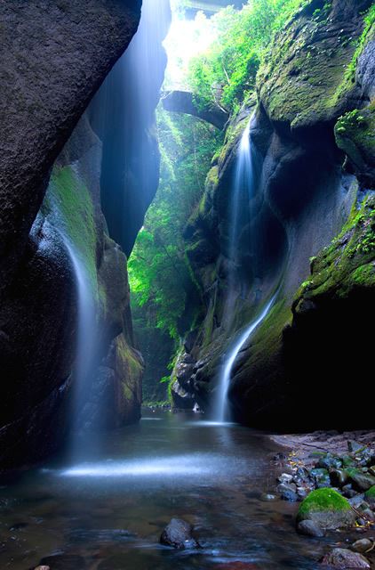 由布岳と鶴見岳の間を流れる由布川の景勝地「由布川峡谷」。幾筋にも糸のように流れ落ちている水流と、滑らかな曲線を描く岩肌は、その美しさから「東洋のチロル」とも称され、涼を求めてたくさんの人が訪れます。