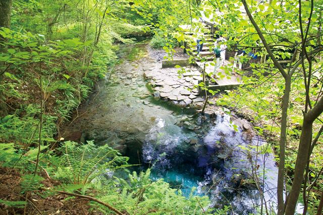 透き通った青い色をした湧水。名水百選に選定されています。水汲みもできるので、ぜひ味わってみて下さいね。 まろやかで喉越しが良いと評判ですよ。