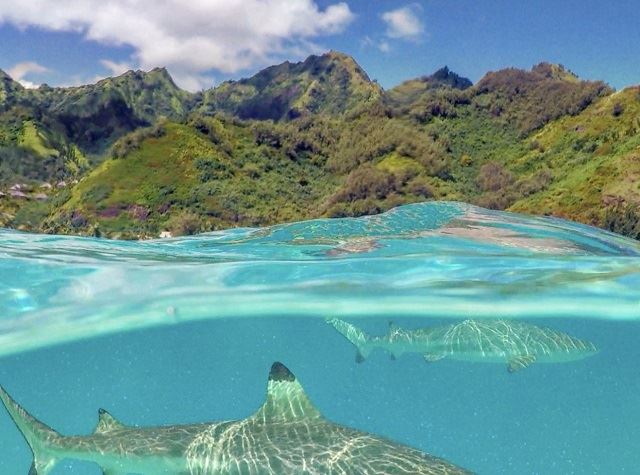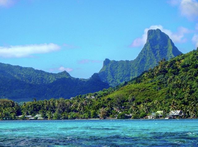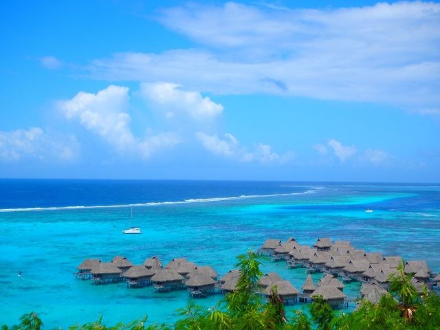 そして、タヒチ本島から船で30分の距離というアクセス抜群のモーレア島。標高2,000メートルを超える山々が連なり、その周りは透明度の高いブルーラグーンが広がります。