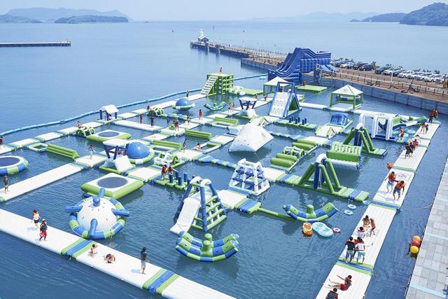 海へ飛び込むトランポリンなど、約50のアイテムが浮かぶ100m×50mの日本最大級の大きさを誇る「海上ウォーターパーク」が今年も登場!今年は人気のジャンピングスライダーがバージョンupでさらにスリル満点!対象年齢:10歳以上(小学生は要保護者同伴)