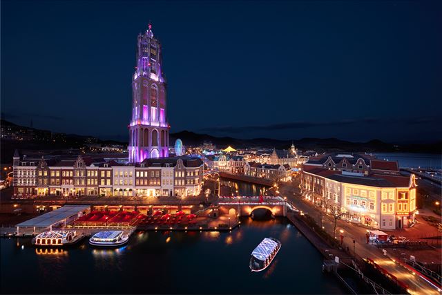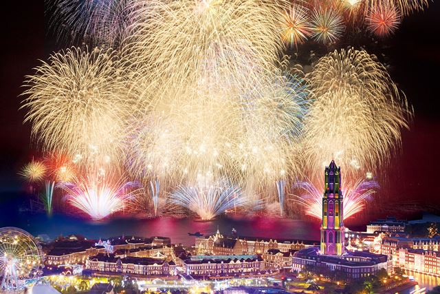 日暮れとともに、広大なハウステンボスの街は、きらめく「光の街」へと一変。街のお城や塔、運河などが美しい光に照らされ、幻想空間へと人々を誘います。