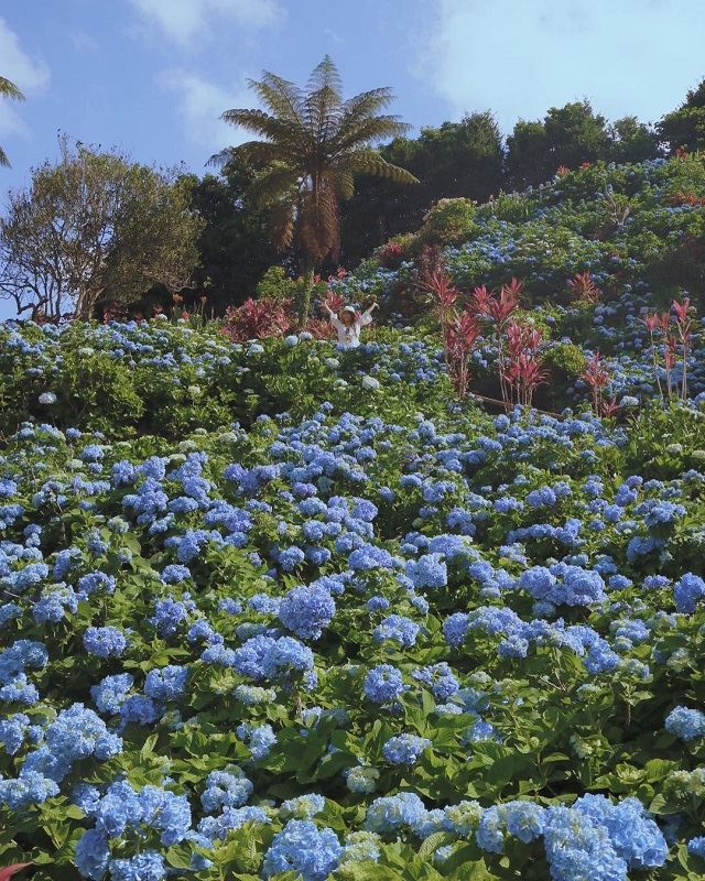 沖縄海洋博記念公園、ちゅら海水族館から車で20分程度の位置する。1万株のあじさいに30数万輪の花が咲き、山の斜面を埋め尽くします。さながらブルーのジュウタンを敷きつめたようなロケーションとなります。