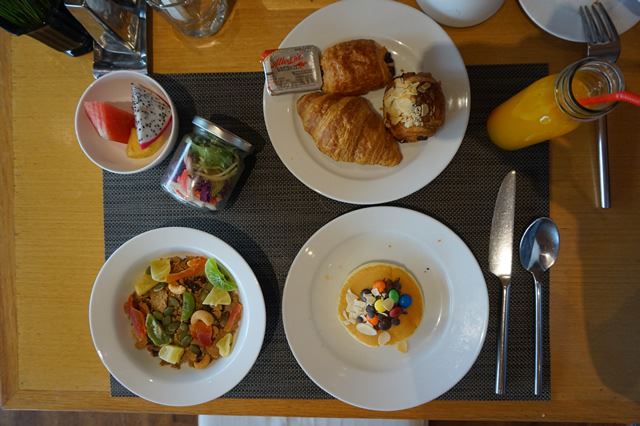 白をベースとしたインテリアが映えるこの綺麗なホテルなのは大満足な朝ごはんビュッフェ付き!