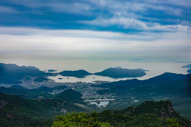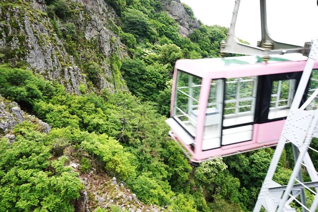 濃い緑の木々と岩の深い谷間をすり抜けるように進む約5分の空中散歩はスリル満点でした。頂上では遠くに瀬戸内海が望め、眼下に絶景が広がっていました。