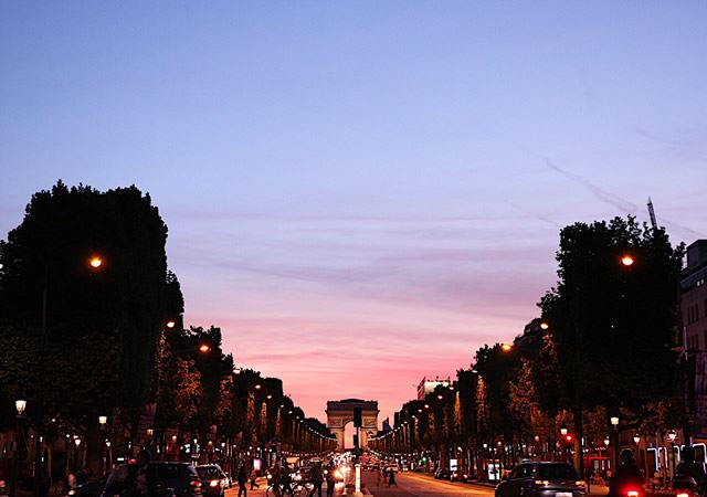 シャンゼリゼ通りから見る夕焼けに染まった凱旋門も素敵でした。
