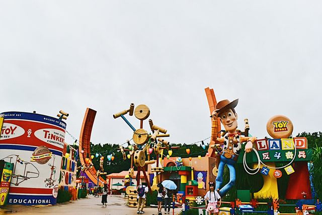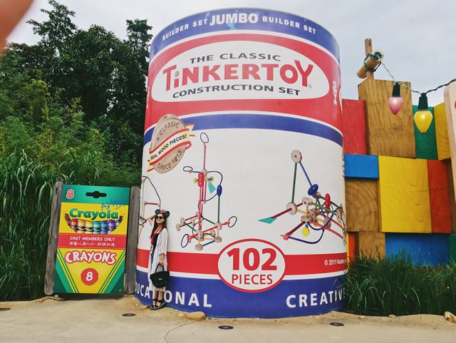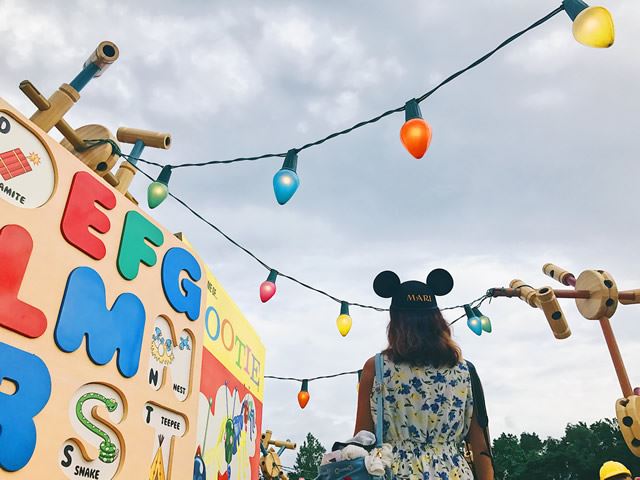 アニメ『トイ・ストーリー』のおもちゃの世界観がそのまま再現されたエリア。巨大なおもちゃがゴロゴロしてて、自分たちが小さくなったような写真が撮れます。色使いもキュートでポップ!