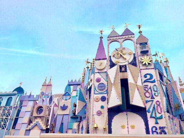 日本のイッツ・ア・スモールワールドと似ていますが、パステルのパープルとブルーが主役なより優しい色の外観です。