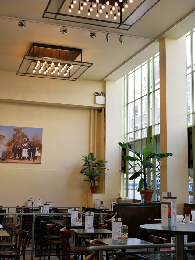 高い天井に上まである窓からたくさんの光が入ってゆっくりするのにぴったりの空間。黄色が効果的に使われた内装は、決してポップになる訳ではなく落ち着いていてとてもお洒落です。