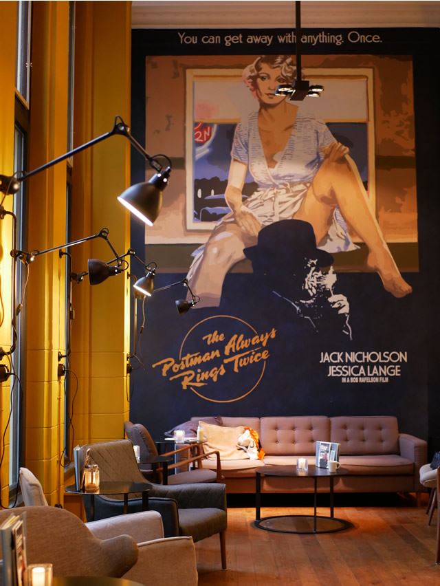 古い元郵便局を改装して作られたホテル。外観に黄色の電飾がお洒落ですね。