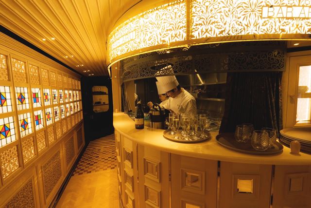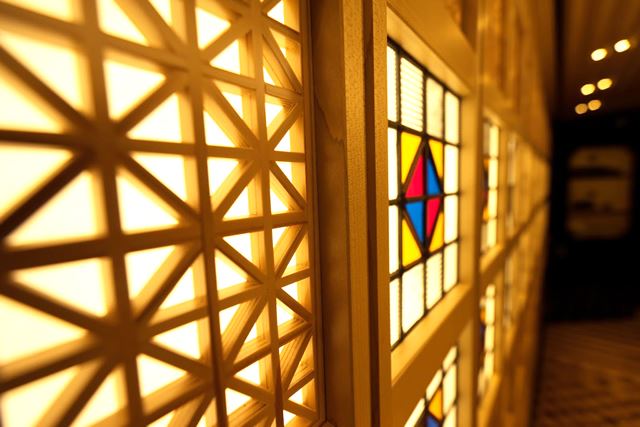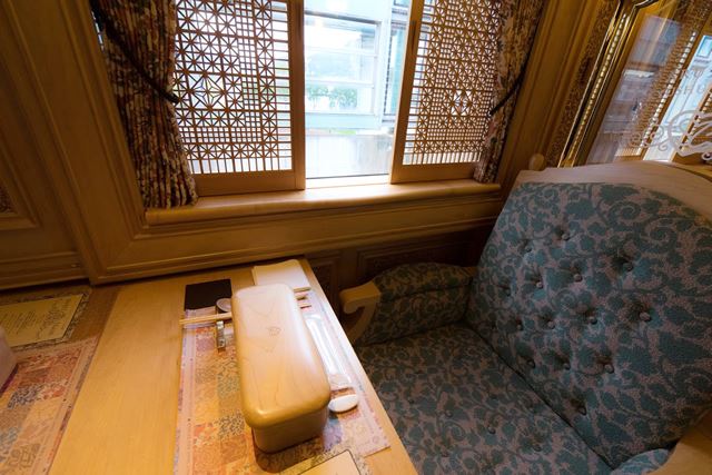 釘を一切使用しない大川組子やステンドグラスが使われたクラシカルな雰囲気は列車内とは思えません。まるで高級ホテル?それ以上のクオリティーに目を奪われます。