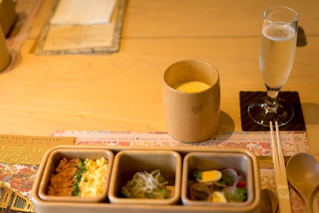 世界のレストランベスト50にも選ばれた南青山・NARISAWAのオーナーシェフ成澤由浩氏がプロデュースするスイーツを堪能します。まずは、「NARISAWA”bento”」と呼ばれる、九州の肉や魚、野菜を使った軽食とスープからスタートします。