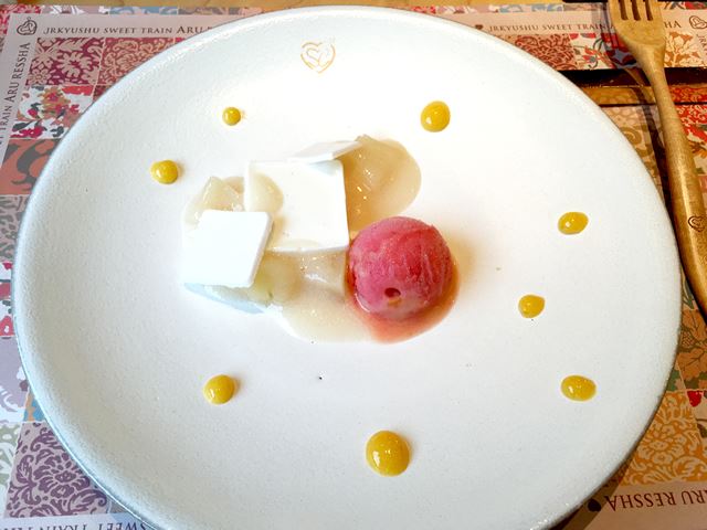 印象的だったのは、「花火」と名付けられた、福岡県産の桃と熊本さんのプラムのコンビネーション。