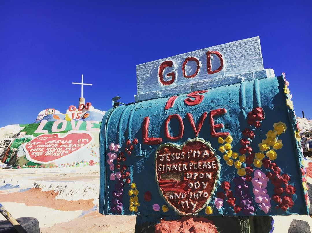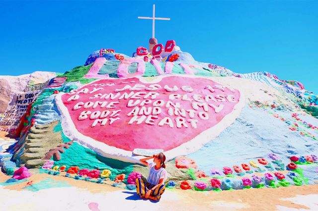 1人のおじいさんが30年という月日をかけて、たった1人で作ったというサルベーションマウンテンは、ロサンゼルスから車で片道約3時間、アメリカならではの壮大な景色を楽しみながら車を走らせ、砂漠を抜けると突如姿を現します。神に対する愛が表現されています。