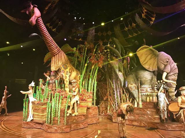 英語と広東語でのショーですが映画のストーリーに沿って進むので、展開を楽しみながら見ることが出来ます。躍動感のある動物たちの動きや生歌も全て完璧な演出で迫力のあるステージから目が離せません。