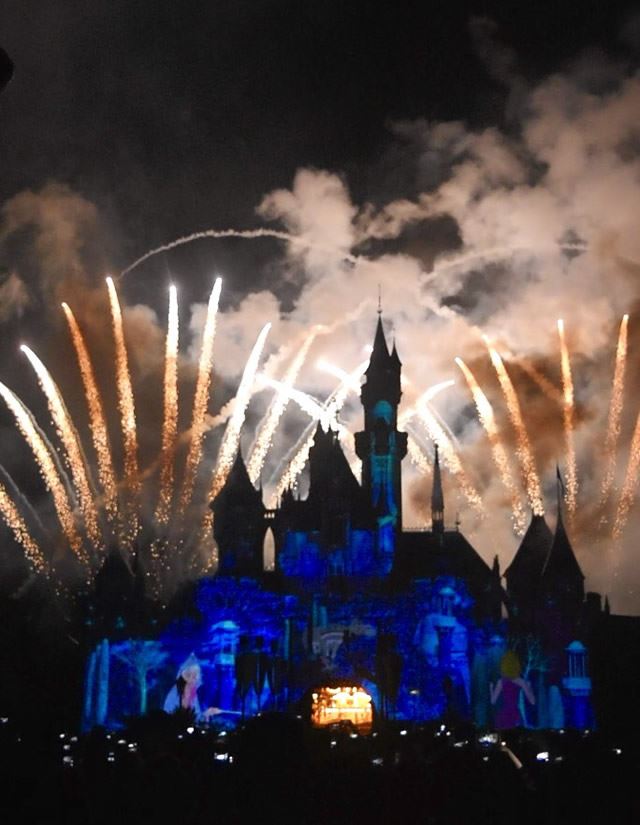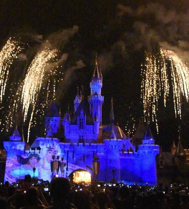 映画の名シーンがプロジェクションマッピングで『眠れる森の美女の城』に映し出され、名曲と共に花火が上がるスペシャルナイトショー。これを見ずには帰れません!