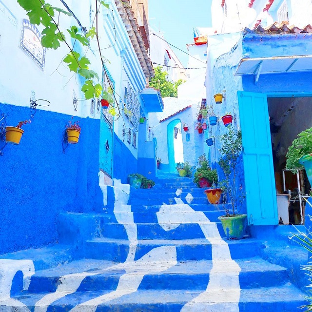北アフリカ・モロッコ北部のリフ山脈の奥深くにあります。決してアクセスがいい場所ではありませんが、山間の美しいブルーの町は「おとぎの国」と絶賛される世界中の旅行者の憧れ。シャウエンの旧市街(メディナ)は、家の壁も道の階段も、水色から深い青色まで、多彩な青で染められています。その理由として最も有力なのが、その昔スペインから追われシャウエンに住みついたユダヤ人によるもの、という説。ユダヤ教にとって青が神聖な色であったことから、家や道をつくる際に青色で染めていったのだそうです。イスラエルが建国されると、シャウエンにいたユダヤ人のほとんどはイスラエルへと移住していきましたが、町を青色に染める習慣だけは残った、ということです。