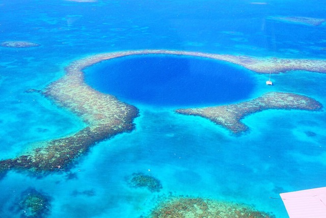 ベリーズ珊瑚礁保護区内のライトハウスリーフという場所に位置し、現地では「海の怪物の寝床」とも呼ばれています。穴の直径は313m、深さは約120mと言われています。ブルー・ホールとは、かつての洞窟や鍾乳洞といった地形が何らかの理由により海中へ水没し、浅瀬に穴が空いたように形成された地形のこと。珊瑚礁保護区では世界第2位の広さの珊瑚礁で、1996年、世界自然遺産に登録されました。