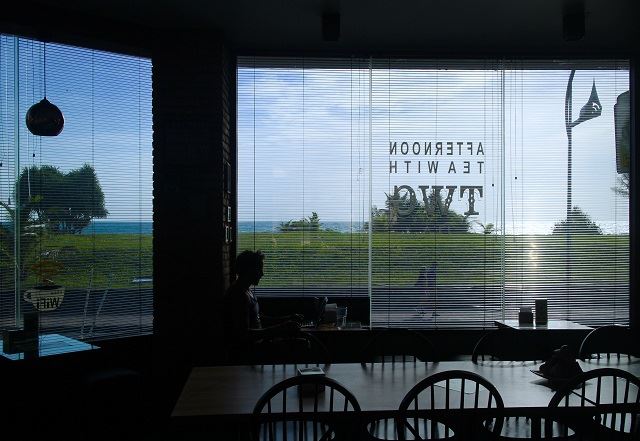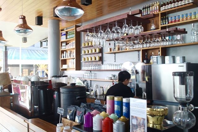 こちらのカフェは店内がスイーツゾーンとコーヒーゾーンに分かれています。コーヒーゾーンはスイーツゾーンと打って変わり、落ち着いたシックな雰囲気の空間です。こちらからはカロンビーチを望むことが出来ます。