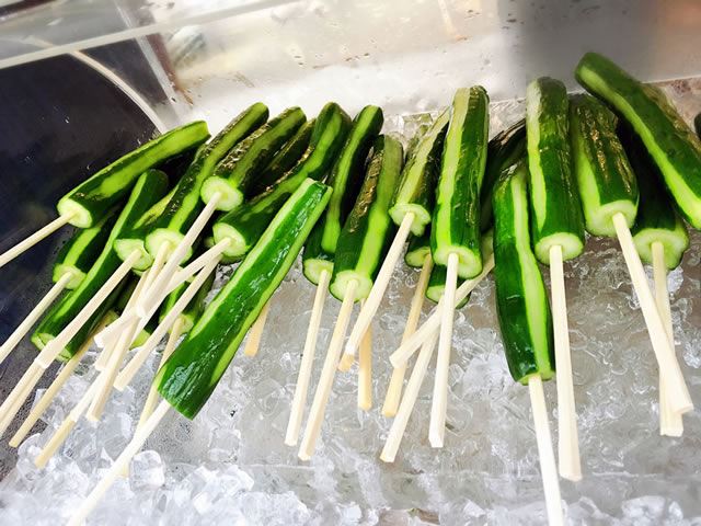 おかげ横丁にある漬物屋「傳兵衛」の冷やしキュウリは大人気!昆布だしに漬けた冷え冷えのキュウリは、暑い夏の清涼剤!!