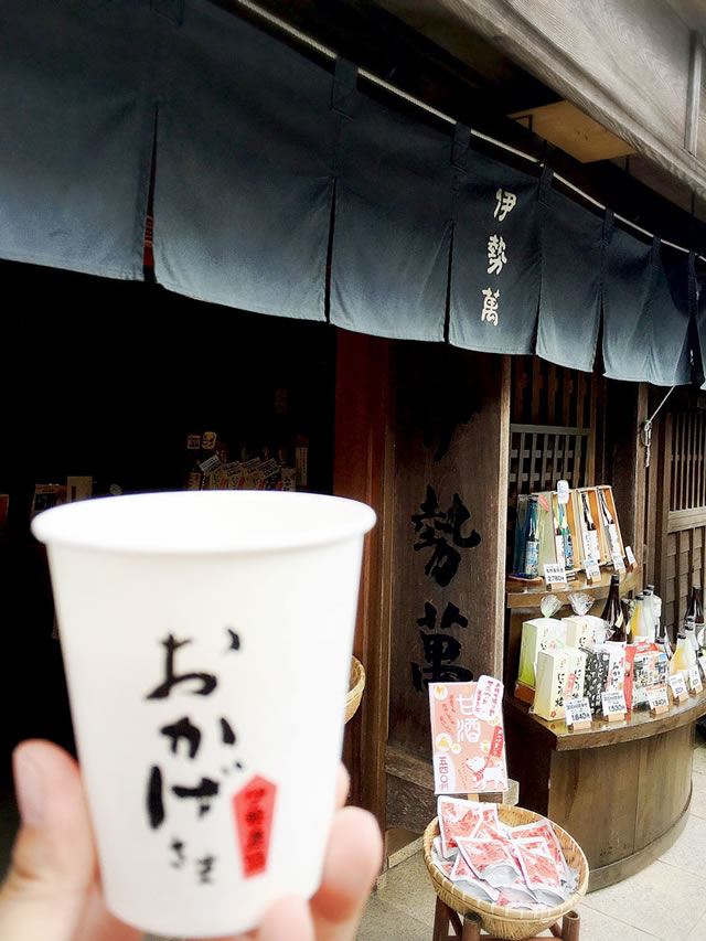もうひとつ、夏の暑い時期にぜひ飲んで欲しいのがおかげ横丁の入口にある“日本一小さな酒蔵”「伊勢萬」の冷やし甘酒。お米の優しい甘さが歩き疲れた体を癒してくれます。