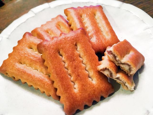 刈谷、御在所、亀山など、愛知県と三重県の境付近のSA、PAに停まったときは、ぜひ「しるこサンド」をオヤツに!サクッとちょっと塩味の利いたビスケットに、あずき&りんごジャム&ハチミツを練り合わせた「あん」が入っている絶品のスナックです。