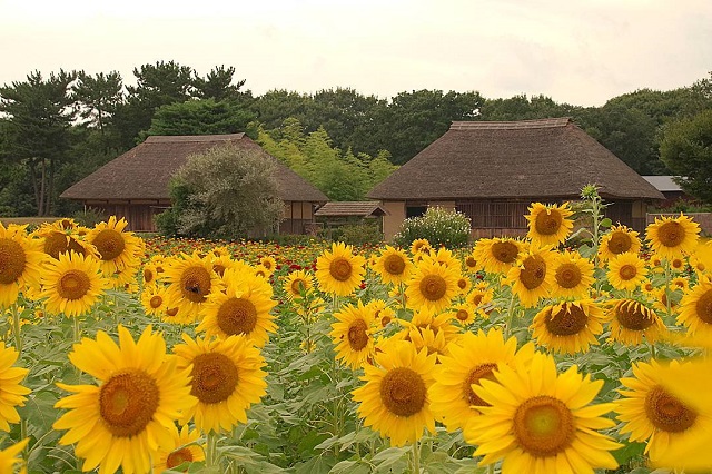 古民家が立ち並ぶ「みはらしの里」には、8月の中旬に、約3万本のひまわりが咲き乱れます。