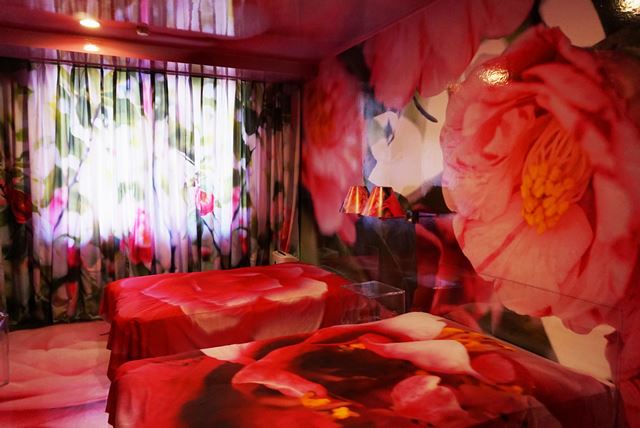 写真家・映画監督の蜷川実花さんとのタイアップで実現した「TSUBAKI」。松山市を代表する花の椿をメインモチーフにベッドのカバーやリネンもこの部屋のためだけに作られたオリジナルです。