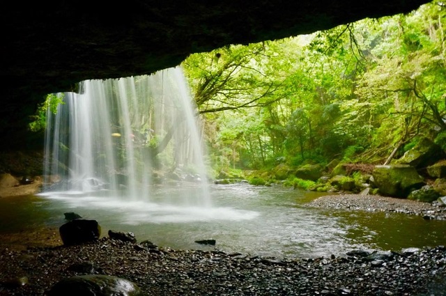 滝の落差は約10mと規模は小さいですが、幅は約20mあり、カーテンのように幅広く落ちる水が木漏れ日に照らされる様子は、とても優美で神秘的!阿蘇のカルデラをつくった約9万年前の巨大噴火でできたとされるこの滝は、長い年月をかけて現在の形になり、滝上部の固い岩盤や滝裏のやわらかい地層は、今も浸食等を繰り返し、少しずつ形を変えています。