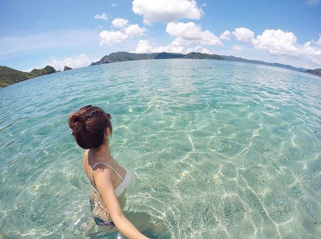 奥行き約30メートル、全長約1キロ以上続く、白い浜が「白浜海水浴場」です。澄み切った海はエメラルドグリーンに光り、その透明度には思わず驚嘆の声を上げてしまうほど。