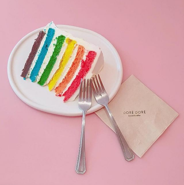 「DORE DORE(ドレドレ)」はフランス語で“黄金の光”という意味で黄金の光の温かさをイメージしたカフェです。レインボーケーキをはじめ可愛いケーキ、セクシーケーキなど、面白い名前のカラフルなケーキが人気です。