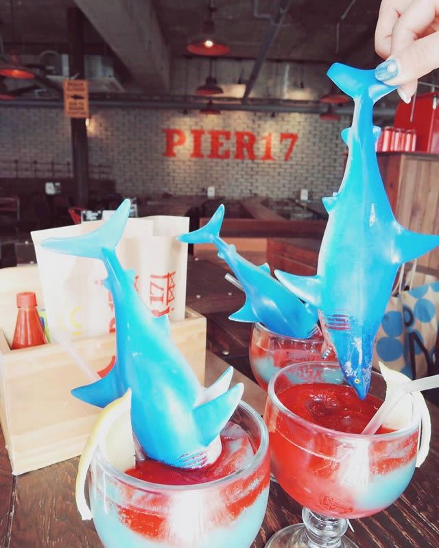全体的にアメリカンな雰囲気のレストラン&バーで、パスタやフライ系など食事からおつまみ系まで揃っています。中でも注目の一品は、サメが血を吐き出しながら添えられている、インパクト抜群なカクテルです!!サメに血(ラズベリーソース)がついた様子はまさにホラーなので、写真映えも間違いなし!?