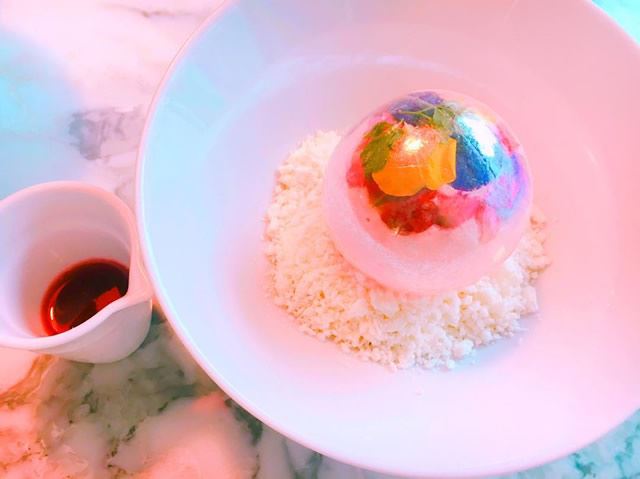 飴でできたボールの中に食べられるお花が入っていて、飴をスプーンで割ってソースを掛けて楽しみます。下の白い粉は冷たくて柔らかいアイスのよう!味はもちろんのこと、見た目も楽しめる一品です。