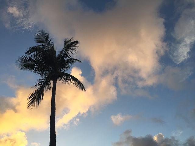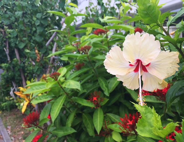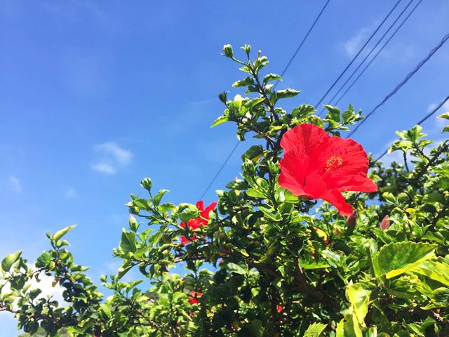 街にはハイビスカスやブーゲンビリアなどが咲き、ヤシの木が生えています。