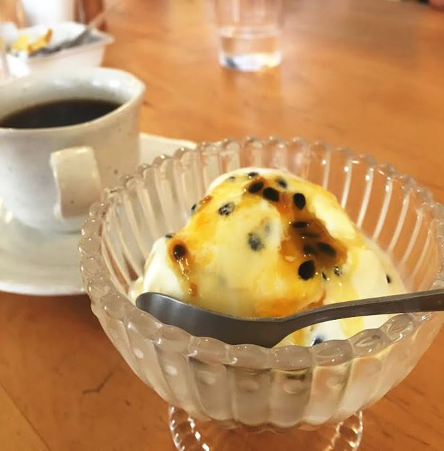 カフェでは、島コーヒーとパッションフルーツソースがかかったアイスクリームを頂きました。
