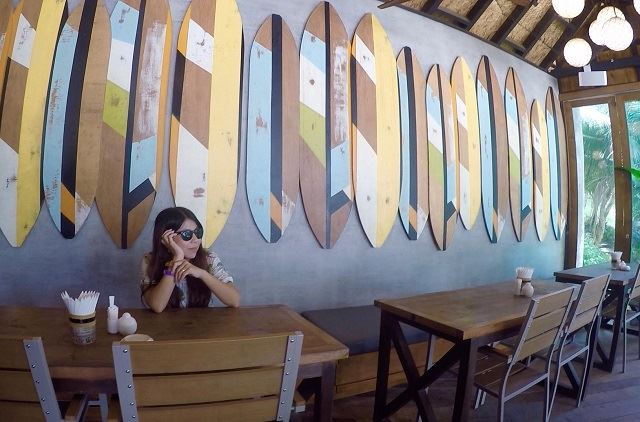ビーチを眺めるカウンター席とオープンエアの室内席があります。メニューはタイ料理とイタリアンがメインです♪レストランの壁にはビーチらしくサーフボードで飾られています!