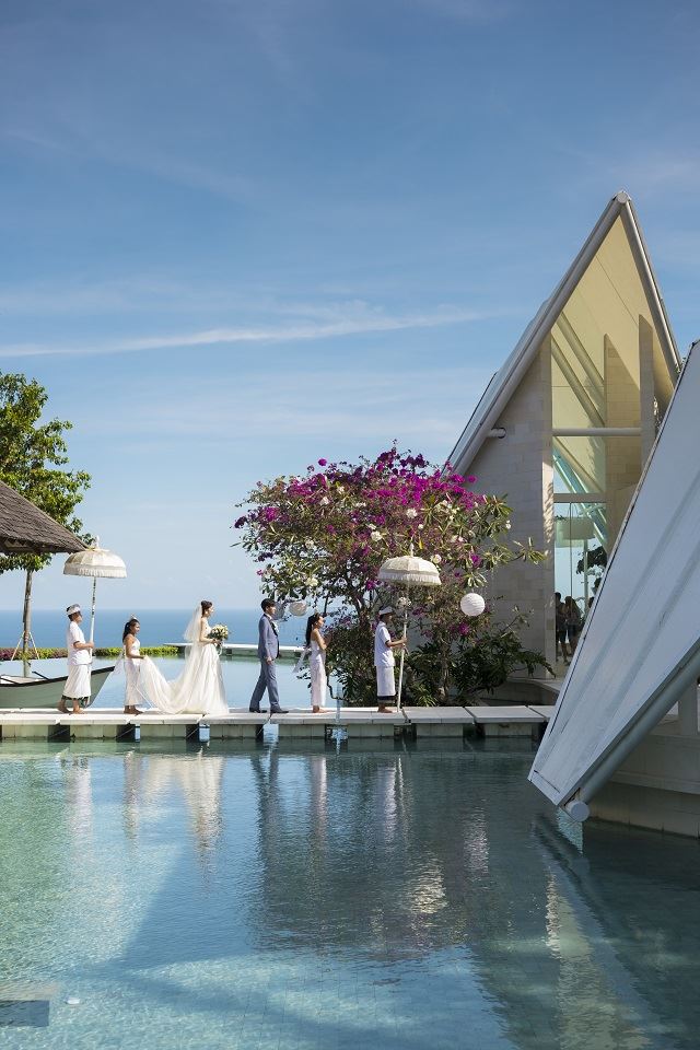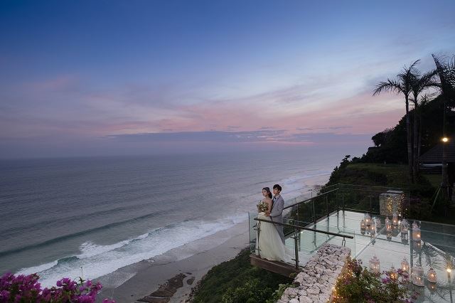 アマンリゾートのデザイナーが世界で唯一手がけたチャペルで、ウルワツの絶景を眺めながらの挙式ができます。ハード面だけでなく、ソフト面も最高のものを提供。ウェディングのための研修を受けたスタッフが100名以上従事し、メイク・フォト・お食事のどれをとっても超一流です!