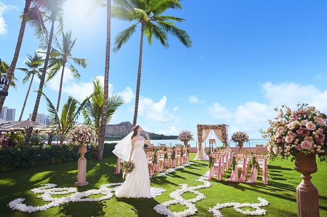「太平洋のピンクパレス」と称される歴史あるホテルを舞台に、海とダイヤモンドヘッドを眺めながらの挙式が叶う式場です。爽やかな風を感じられるハワイだからこそのガーデン挙式を、流行り廃りに影響されない格式あるホテルで行う大人のウェディング!