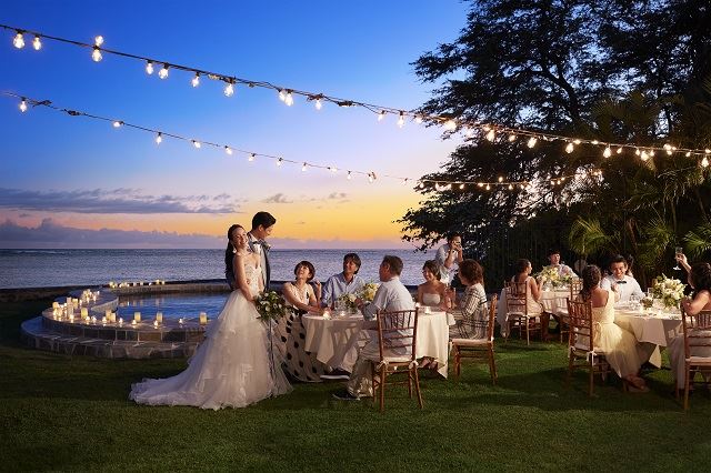 大切なゲストを自分達の別荘に招いたような空間で、自分達らしい時間を演出できます。昼間の明るい時間で、青い海を目の前で楽しむのもオススメですが、夕方挙式も空の移り変わりが楽しめて人気!