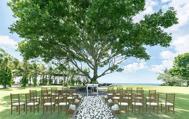 目の前に広がる青い海と母なる大樹に見守られながら愛を誓うナチュラルウェディング。実は世界中のセレブがパーティーなどを行う広大なスペースをお二人だけのために貸し切ることができる!