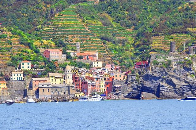 チンクエ・テッレの中で一番美しいといわれているヴェルナッツァ。カラフルな建物の上にはブドウ畑が広がっている緑と建物のコラボが美しい景色にうっとりです。