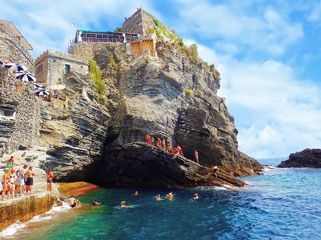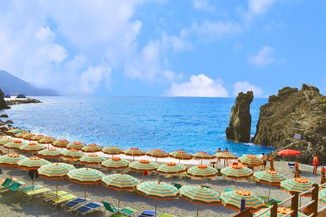 モンテロッソと言えば、世界遺産のなかの美しいビーチ。パラソルがきれいに並べてあるヨーロッパならではの砂浜は圧巻の景色です。切り立った岩から飛び込む人や観光客の楽しそうな声が印象的です。