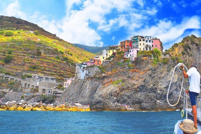 船からマナローラの景色。船着き場にサクッとロープで接岸する船頭さんたちの慣れた手つきは見ものです(笑)30分おきくらいに出ている船ですが、チケットを単発で購入しようとしたら、なんと売場が出航5分前にしか開かないと書置きが、、、いかにも陽気なイタリア人らしくアメリカの観光客のおじさんと、果たして船に乗れるのかと不安にじーっと待っていたのも楽しい思い出♪