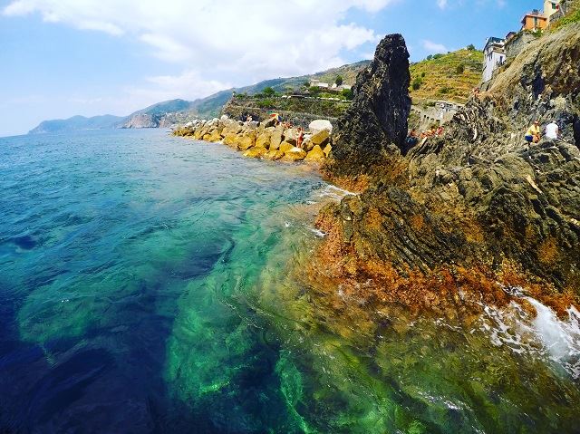 この海の色忘れられない!岩が海の中でエメラルドグリーンに輝くってありえない感動。断崖にそびえたつ岩場がビーチになっちゃうチンクエ・テッレな光景は素敵すぎますね。