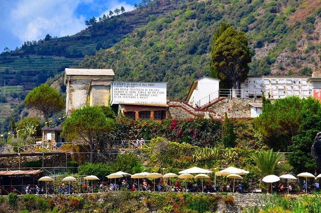 カフェのパラソルがかわいい♡マナローラの丘の上。のんびりとエスプレッソやワインでゆったりしたいお勧めスポットです♪