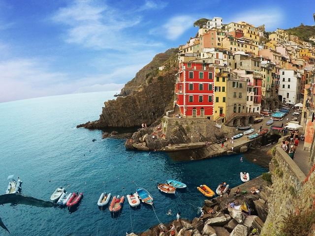 チンクエ・テッレの代表的な景色♡ もう感動しっぱなしのリオマッジョーレ!ここはチンクエ・テッレでも大きな村。澄み切った青い海に浮かぶボートや海に飛び込む人々、カラフルな建物、生活観の中の素晴らしい景観!