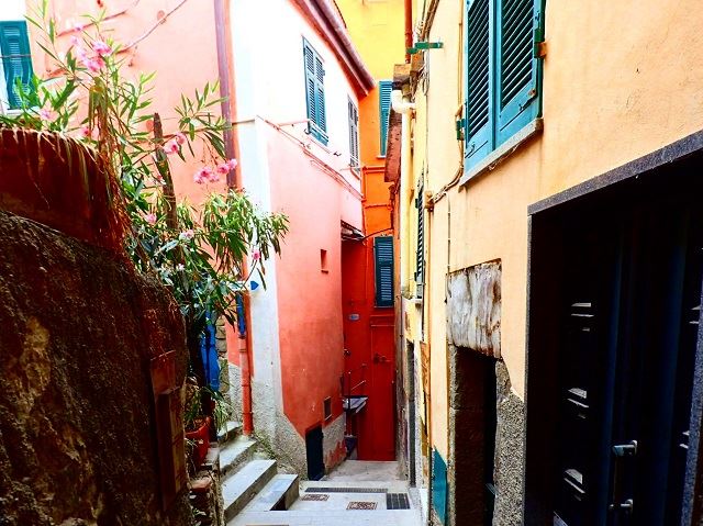 モンテロッソの旧市街はピンクやイエローの建物にお花が植えられていてとっても可愛い。干してある洗濯物までオブジェになっているのがいかにもイタリア♡