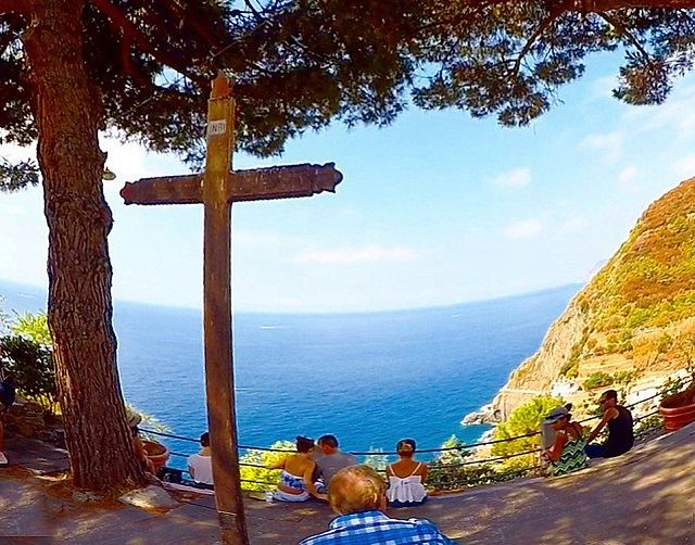 電車で着いて急な階段を上りきると、そこにはリグリア海を一望!ベンチと十字架がなんとも絵になる光景にしばし休憩(#^.^#) やっぱりこういうところはカップルが多かったかな~♡