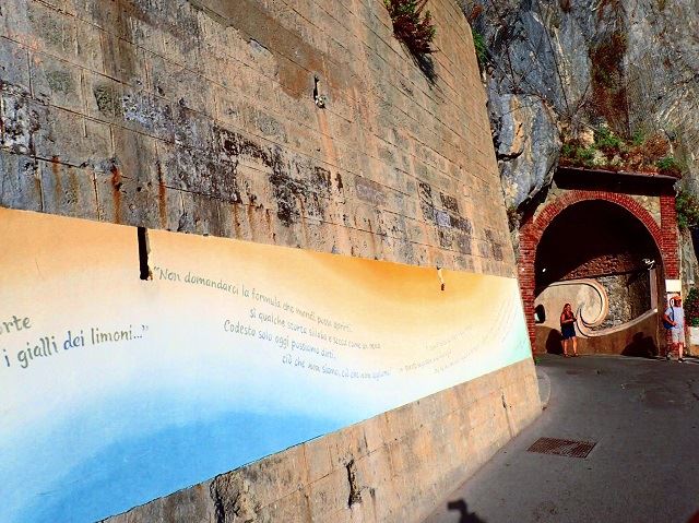 モンテロッソは旧市街地と新市街地に分かれ、船が着くのが旧市街。新市街はこのトンネルを抜けたところにあります。波のオブジェのかわいいトンネルを抜けると整列されたパラソルの広大なビーチが目の前に。海の色とパラソルの並びが印象的で美しい海岸はゆったりと訪れたいところ!
